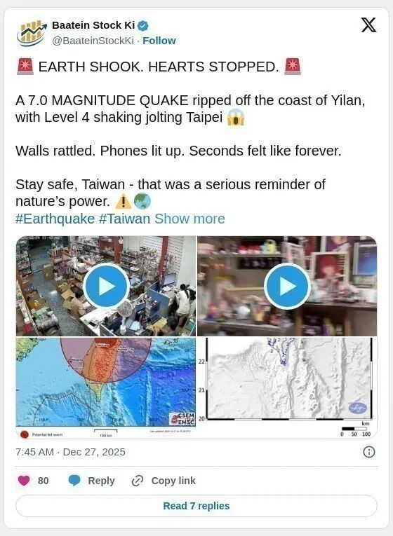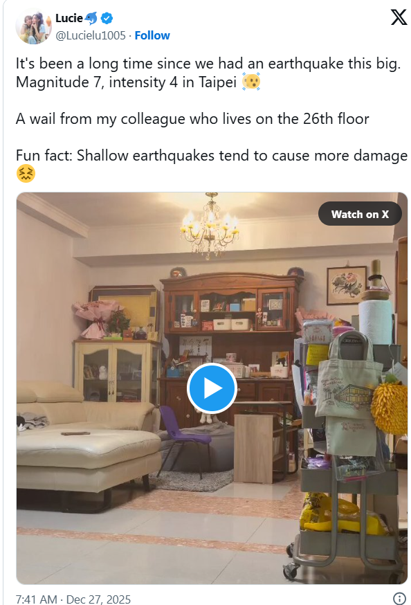 此次地震发生在12月24日台湾东南沿海台东县曾发生6.1级地震之后不到一周。