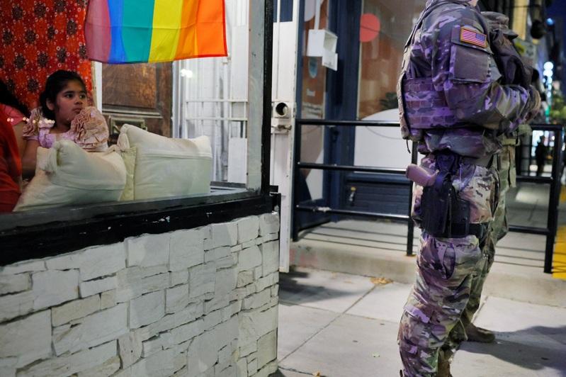 一名女孩于今年8月底与家人在华府洛根圆环(Logan Circle)区一家餐厅用餐时,望向街外佩戴随身武器巡逻的俄亥俄州国民警卫队成员。(路透)