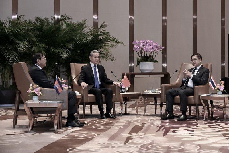 中国外长王毅(中)、泰国外长希哈萨(右)和柬埔寨副总理兼外长巴速坤(左)29日在云南就泰柬巩固停火局面、恢复正常交往、致力重建政治互信、推动双边关系改善及维护地区和平稳定。(泰国外交部提供)中央社