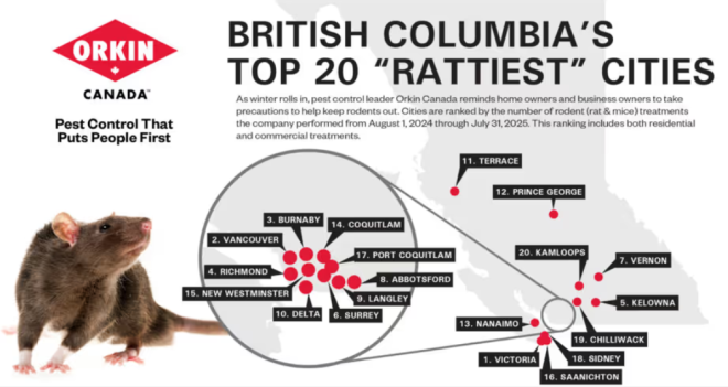 该排名基于Orkin在2024年8月1日至2025年7月31日期间完成的老鼠防治服务次数,涵盖住宅和商业场所。在全国范围内,老鼠问题最严重的城市依次为多伦多、维多利亚和温哥华。安省同样面临严峻的老鼠问题。其中多伦多长期位列全国首位,是加拿大老鼠活动最频繁的城市之一。而在BC省内部排名中,维多利亚位列首位,温哥华紧随其后,本拿比、列治文、素里、高贵林、新西敏等多个大温城市也悉数上榜。