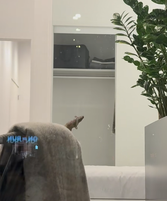 网友B在Richmond Center的售楼中心,目睹一只老鼠直接爬上样板房的椅子靠背,在室内来回张望、停留了好一会儿,完全不怕人,比销售顾问更先“迎客”。