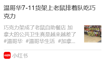 刷不完的“老鼠帖”小编在网上随手一搜“温哥华老鼠”,几乎不用下滑就能看到一连串带实拍图的帖子。网友A在温哥华一家7-11便利店拍到,巧克力货架竟成了老鼠的“自助餐台”,包装被啃得一片狼藉。