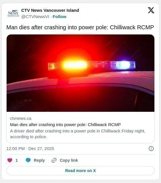 签到 欢迎!登录你的帐户 您的用户名 您的密码 Forgot your password? Get help 找回密码 恢复您的密码 您的电子邮件 密码将通过电子邮件发送给您。 失控撞上电线杆 司机惨死!超速可能是促成因素 2025年12月29日 加拿大新闻 分享 Facebook Twitter Pinterest WhatsApp 据警方消息,周五晚间,一名司机在奇利瓦克(Chilliwack)撞上电线杆后身亡。 奇利瓦克皇家骑警表示,这起单车事故发生在晚上10点20分左右,地点位于耶鲁路和班福德路的交叉路口。 “一名27岁的奇利瓦克男子是车上唯一的乘客,他失去控制撞上了电线杆”,皇家骑警在周六的一份声明中写道,“虽然警方认为酒精并非事故原因,但超速可能是促成因素”。 根据CTV的报道,事发区域封闭数小时,警方和事故分析师对事故展开调查。 警方呼吁任何知情人士或持有相关视频的人士拨打604-792-4611与警方联系。 热点 天津医院护士更衣被偷拍 还放色情网站 9分钟视频疯传 admin - 神舟21号「太空小鼠」生宝宝 中社科院:太空经历让保护欲更强 admin - 制造更多碳排放… 圣诞礼物退货率 衣服鞋帽最高 admin - 年长熟客突然不来喝汤了 佛州餐厅主厨警觉上门救回1命 admin - 用免费火锅招募会员:华人保守党协会下什么大棋? - 福建男每天穿低价羽绒外套超过12小时 确诊一病症 admin - 前一篇文章大温抢Offer大战再起! 5年新独立屋高出叫价$80万下一篇文章BC省一只熊崽被严重烧伤,正治疗康复中 士嘉堡民宅火灾亚裔女子去世:其丈夫“正在为生命而战” - 2025年12月29日 一件羽绒服$2000! 加拿大鹅还值得买吗? 多伦多网友吵翻了… - 2025年12月29日 多伦多一处老人公寓起火,8旬老人不幸身亡 - 2025年12月29日 发表评论取消回复