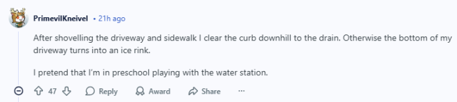 更有趣的是,一位网友认为:“水流走的声音真舒服,就像YouTube视频里那样!哈哈!” 另一位网友附和道:“可以做个ASMR视频,铲雪时的咔嚓声,和水流走时的嗖嗖声。”(ASMR原意是“自发性感觉经络反应”,俗称“颅内高潮”)