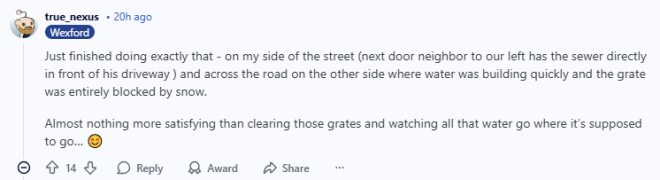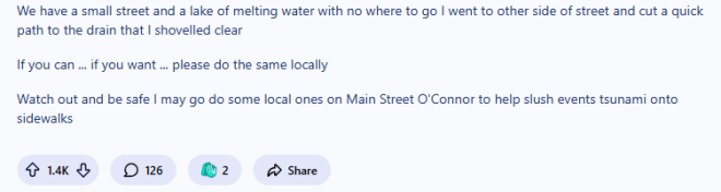 这位热心人还表示:“注意安全,我一会儿可能会去Main Street / O’Connor一带,帮忙清理几个下水口,防止融雪像‘雪泥海啸’一样冲上人行道。”