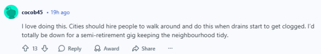 “我刚刚也挖了。不仅挖了自家门口的,还挖了马路对面的下水口。清理这个会令人感到十分舒畅。”
