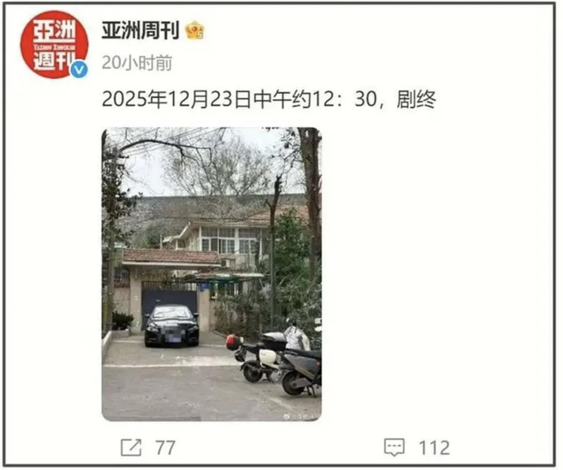 12月23日,《亚洲周刊》发布一张南京民国别墅照片,配上「剧终」两个字。