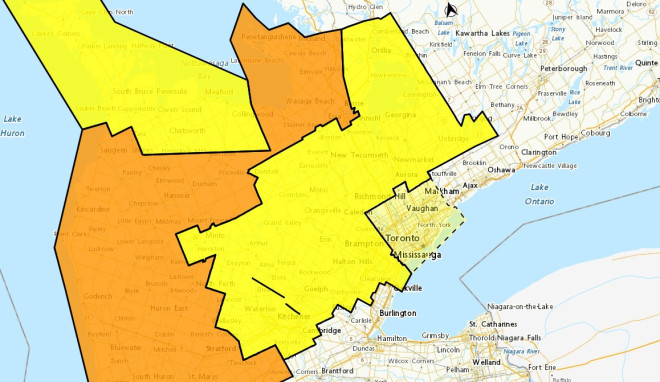 加拿大环境部对多伦多市在内的GTA部分地区发布了“黄色警示”,预计今天下午开始将出现零星降雪。