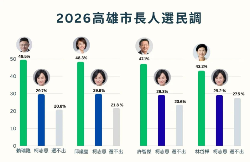民进党2026高雄市长初选将在明年1月中旬进行初选民调,Newtalk新头壳今天公布最新民调指出,4位参选人赖瑞隆、邱议莹、许智杰和林岱桦,对上蓝营战将柯志恩皆胜出;无论在对比式、互比式民调中,赖瑞隆都居领先。