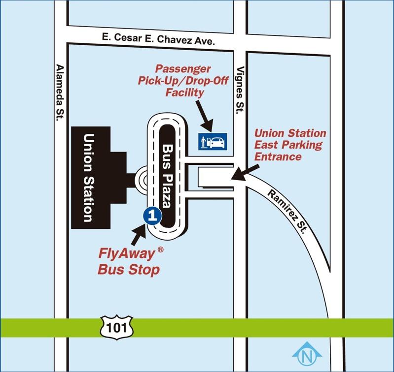 Union Station的上车位置也相对明确,设于其巴士广场 (Bus Plaza),旅客可依站内指针步行前往,现场设有FlyAway标识。自驾前往的旅客,可将车停放在巴士广场下方停车场,入口位于Vignes Street。该停车场每日收费8美元,最长可停放30天。