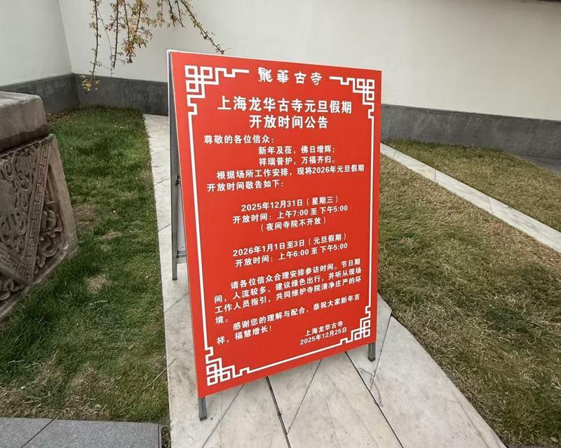 上海知名古寺龙华寺2025年12月31日于门口设置告示牌说明,从当日至2026年1月3日元旦假期,每日仅开放至下午17时。记者谢守真/摄影