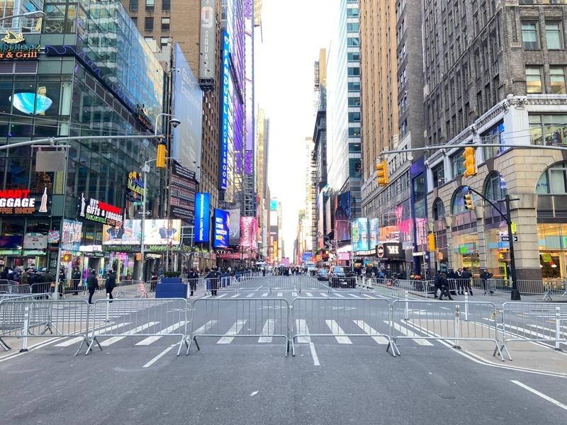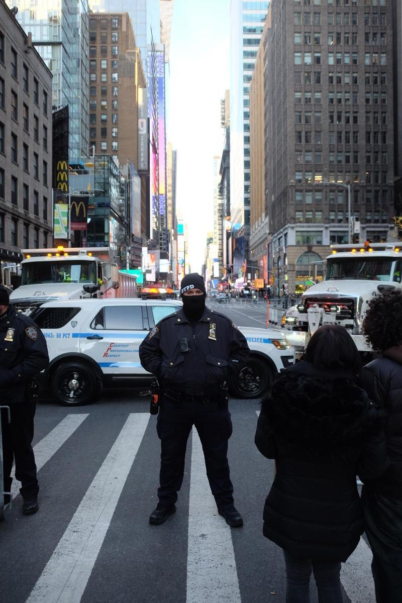 纽约时报广场跨年秀从12月31日晚6时开始,纽约警方严阵以待,「世界的十字路口」被重重包围。入场者必须经过安全检查,禁止携带雨伞、背包、折叠椅、野餐垫、无人机以及酒精制品。而访客一旦进入封闭区域,则只能单向离开,如欲回到场内,则必须重新接受安检,且入场后只能跟随指引前往指定等候区域。