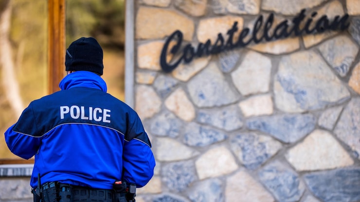 瑞士克莱恩-蒙塔纳一名警察进入火灾现场,名为星座(Le Constellation)的酒吧