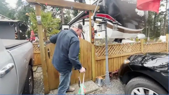 周一,纳奈莫(Nanaimo)的退休人士迈克·丹尼斯(Mike Dennis)站在他的大型房车前,门口装饰着亚利桑那购入的瓷砖和一棵棕榈树,乍看之下仿佛正如以往在美国度冬的典型“雪鸟”。