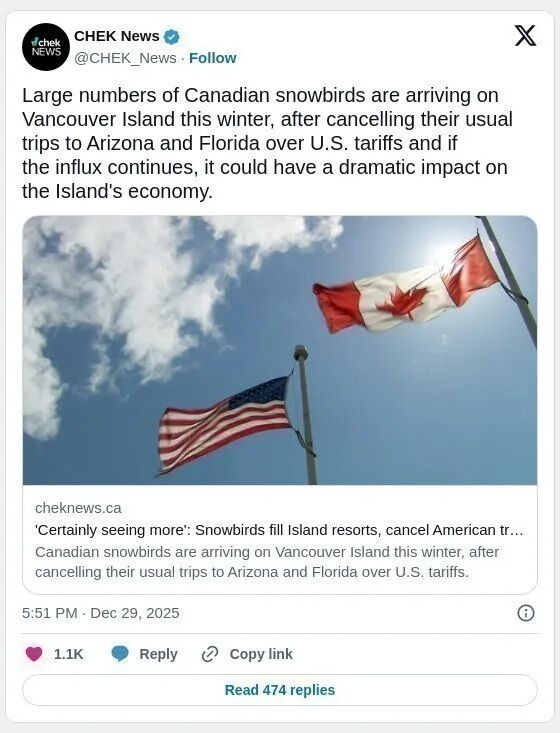 随着美国关税问题持续发酵,今年大量加拿大“雪鸟”取消了前往亚利桑那州和佛罗里达州的冬季旅行,转而涌向温哥华岛,这一趋势若持续,可能对岛上的经济产生重大影响。