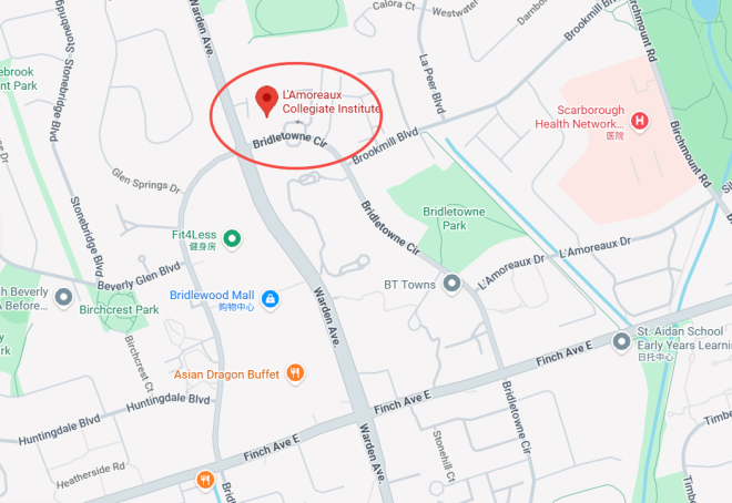 L’Amoreaux高中建于1973年,位于士嘉堡Finch和Warden附近,紧邻Bridlewood Mall商场。
