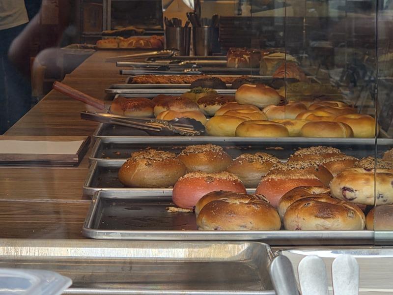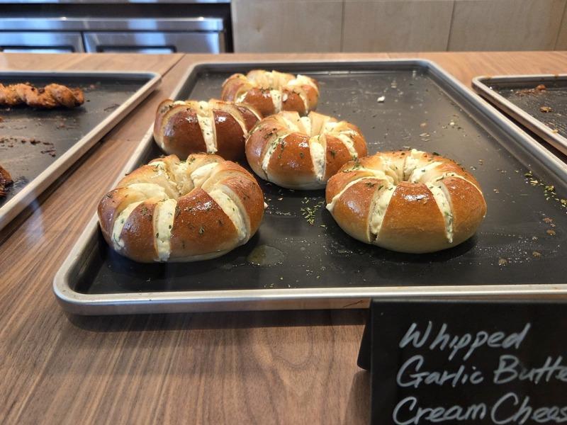 MIOPANE店面装潢简约明亮,采全开放式设计,顾客可通过透明玻璃柜台,清楚看到各式贝果陈列其上,包括共推出20多种口味,从咸到甜、从创新到经典一应俱全。热门口味包括蓝莓起司、草莓奶霜、草莓牛奶、酥脆抹茶白巧克力、抹茶栗子起司等;也有全麦素食选择,如素蓝莓、素地瓜、素柠檬等。柜台后方即为制作区,师傅们现场揉面、发酵、烘烤,全程可见,新鲜出炉的贝果香气四溢。