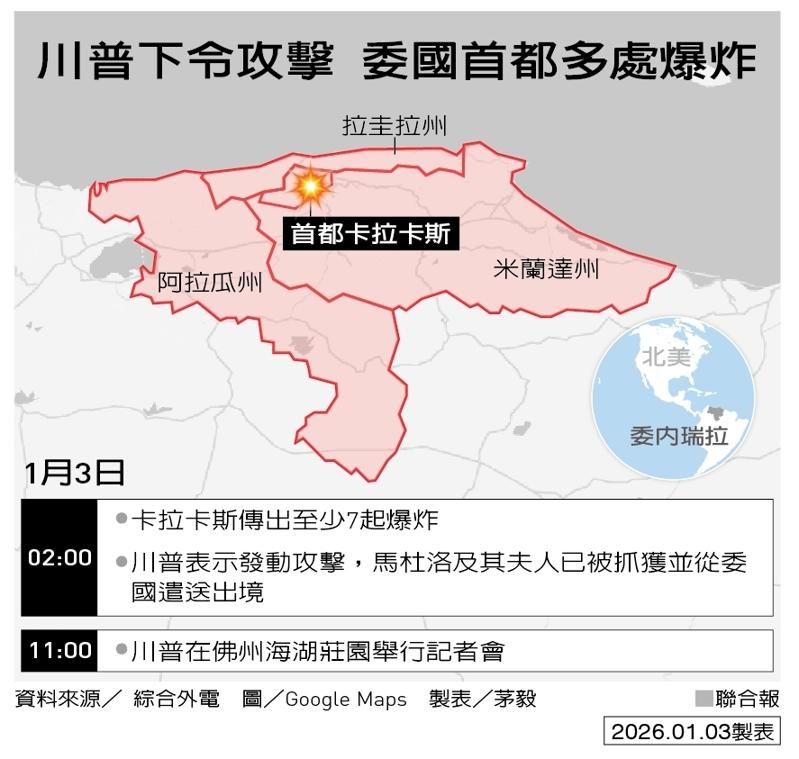美国总统川普3日稍早已发文说,美国已成功对委国及马杜洛发动大规模袭击,马杜洛及其夫人已被抓获并从委国带离,此次行动是与美国执法部门共同进行。川普说,详情稍后将公布,美东时间3日上午11时将在佛州海湖庄园举行记者会。
