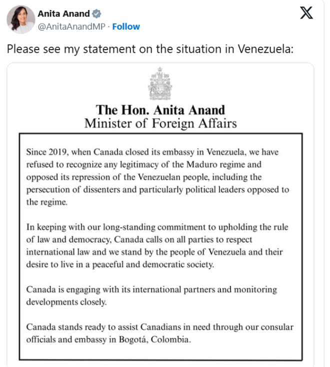 外交部长阿南德在社交媒体发表声明说,加拿大“自始至终拒绝承认马杜罗政权具有任何合法性,并反对其对委内瑞拉人民的镇压,包括对异议人士,尤其是反对该政权的政治领导人的迫害”。