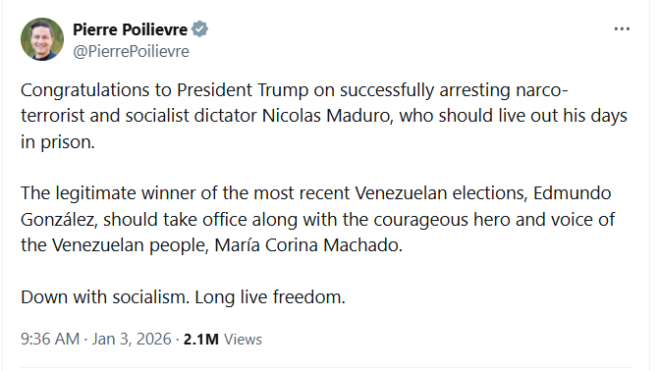 加拿大多名政界领导人对美国夜间打击委内瑞拉首都并随后抓捕委内瑞拉总统尼古拉斯·马杜罗一事反应不一,有人庆祝,有人谴责。