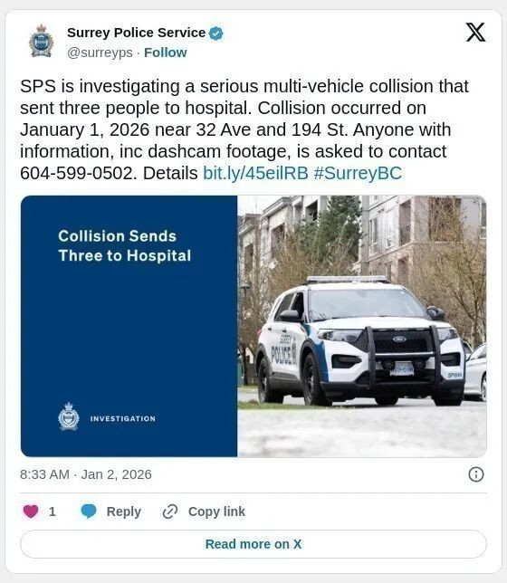 素里警察局请求任何目击碰撞事故或拥有现场行车记录仪视频的人士拨打该部门的非紧急电话 604-599-0502,并引用档案编号 26-261 (SP)。