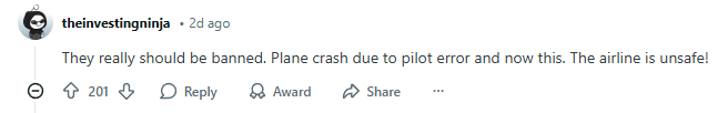 “他们真的应该被禁飞。之前的飞机失事是飞行员操作失误造成的,现在又出了这档子事。这家航空公司太不安全了!”