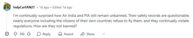 “我一直很惊讶印度航空和巴基斯坦国际航空竟然还没有被禁飞。它们的飞行安全记录令人质疑,几乎所有人都拒绝乘坐它们的航班,包括它们本国的公民,而且它们还屡次违反相关规定。它们怎么还没有被禁飞呢?”