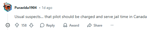 “属于惯犯了……那名飞行员应该被起诉并在加拿大服刑。”