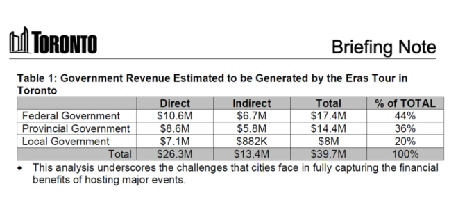 这些数字来自市政厅的“Swiftonomics”报告。这是一份简报,于4月下旬提交给市议员,但此前并未公开。多伦多市是在《Toronto Sun》提出信息申请后才提供了这份文件。