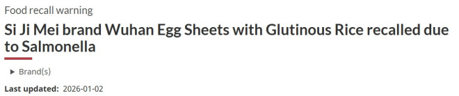 加拿大食品检验局(CFIA)宣布,在阿尔伯塔省和卑诗省(BC)召回四季美(Si Ji Mei)品牌的“武汉豆皮”,原因是该产品可能受到沙门氏菌污染。