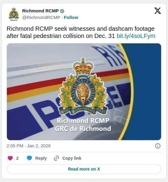 列治文皇家骑警(RCMP)呼吁公众协助,寻找目击者,以调查一起发生在12月31日、涉及行人的致命交通事故。