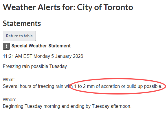 今天中午11点多,环境部将多伦多的黄色降雪警告更新成了灰色特殊天气预警:从周二早上到下午,预计将出现持续数小时的冻雨,局部地区可能形成1至2毫米的结冰(或冰层累积)。