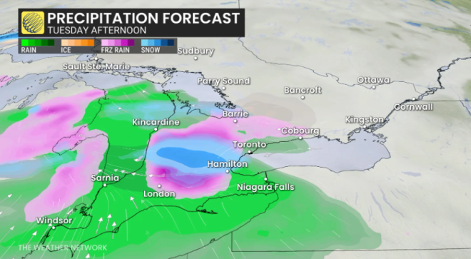 预计周二上午晚些时候,从安省西南部开始,将出现雨雪混合天气。随着暖锋推进,GTA西北部内陆地区更容易出现冻雨。