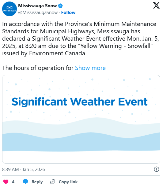 据天气网络1月5日报道,今早,大多伦多地区(GTA)部分区域一度发布黄色降雪警告,全天降雪量最高可达10厘米,通勤一片混乱。在早上8点20分,密西沙加市还宣布进入了重大天气事件状态。