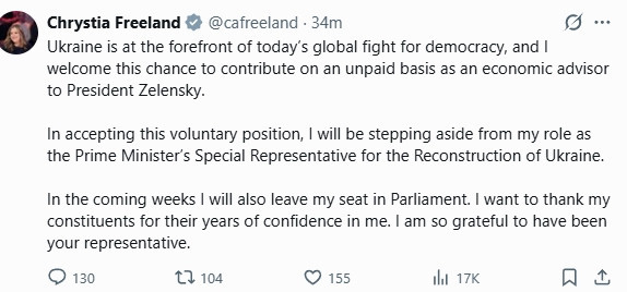 加拿大前资深内阁部长、前副总理方慧兰(Chrystia Freeland)表示,她将辞去国会议员职务。这一决定公布前仅数小时,乌克兰总统泽连斯基(Volodymyr Zelenskyy)宣布已任命她为经济发展顾问。