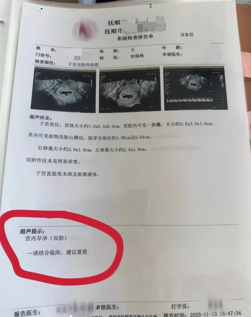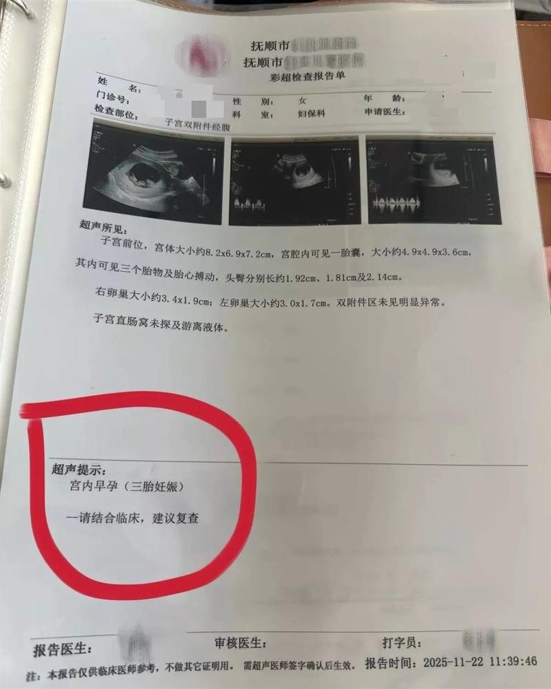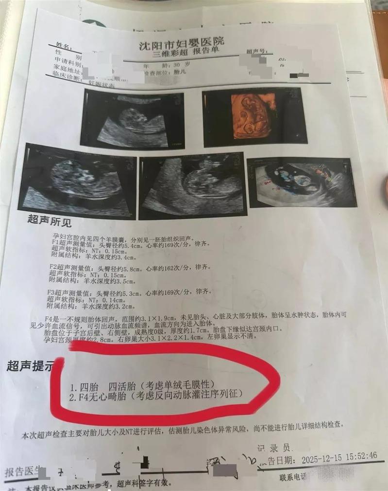极目新闻报导,王女表示,她于去年9月自然受孕,11月在抚顺市妇幼保健院进行产检,第一次检查显示为单胎,第二次为双胎,第三次变为三胎。为厘清实际状况,她于12月前往沈阳市妇婴医院复检,彩超结果显示为四胎。
