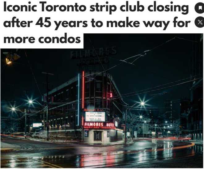 帖文确认,Filmores 的关闭并非经营不善,而是早已酝酿多年的重建计划终于落地。早在 2020 年,地产开发商 Menkes Developments 就买下了 Filmores 脱衣舞俱乐部及其附属酒店所在的整块物业。