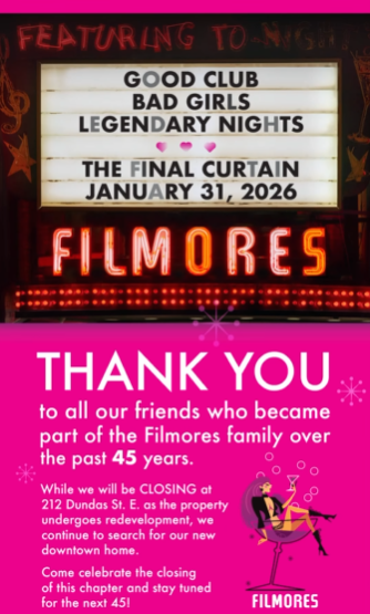 这家成人娱乐俱乐部在 Instagram 上发布消息称,将于本月底关闭其位于 Dundas Street East 的标志性门店,并向顾客表达感谢:“感谢在过去 45 年里,所有成为 Filmores 家庭一员的朋友。”