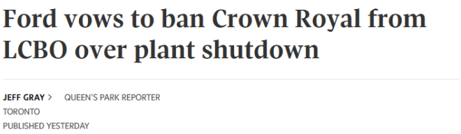 安省省长道格·福特(Doug Ford)周一(1月5日)公开放狠话:如果威士忌品牌Crown Royal的母公司执意按计划关闭安省工厂,这款酒将被直接从LCBO货架上下架。