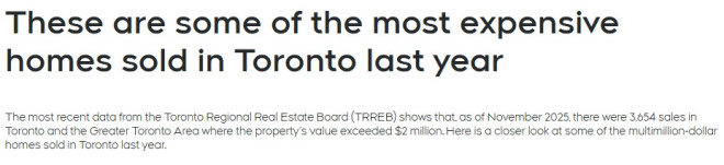 多伦多地产局(TRREB)的最新数据显示,截至2025年11月,多伦多及大多伦多地区(GTA)共有3654宗成交房产的价格超过200万加元。