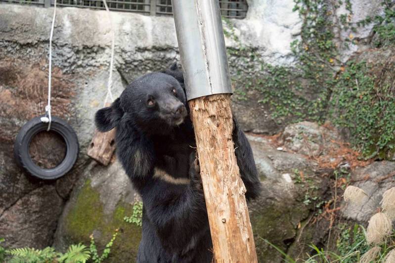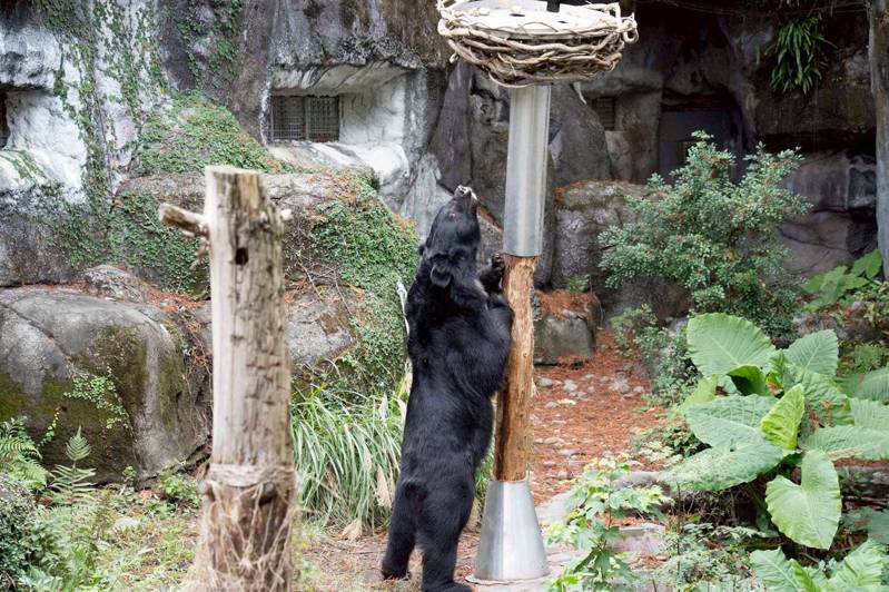 台北市立动物园台湾动物区的黑熊活动场近期出现一根新的行为丰富化设施,「黑熊晃晃柱」像棵树又像鸟巢般地伫立地面,让动物通过嗅闻、啃咬、摇晃让上头的食物「从天而降」。园方透露,黑熊使用设施时偶会站起身像「工读生」是自然行为。