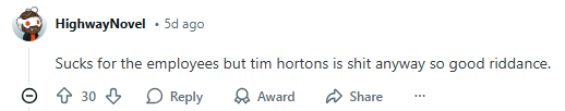 “这里的员工确实挺惨的,但话说回来,Tim Hortons反正也烂透了,关了倒清静。”