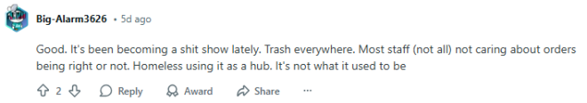 “关了正好。那地方最近简直乱爆了。到处都是垃圾,大多数员工(也不是全部)根本不在乎有没有做错单。流浪汉还把它当成了据点。早就不是以前那个样子了。”