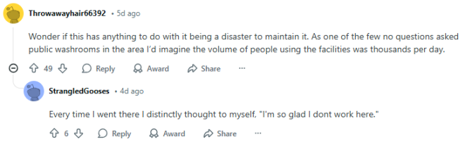 “我在想,这事儿是不是因为那儿太难打理了?毕竟那是附近少数几个不设门槛的公厕,我猜每天少说也有好几千人在用,维护起来估计就是个灾难。”