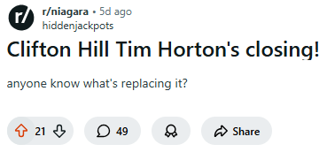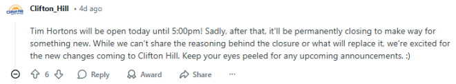 Clifton Hill的官方账号在评论区证实:“这家Tim Hortons今天(1月5日)将营业到下午5点。很遗憾,之后这里将永久关闭,为新的项目让路。”
