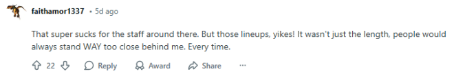“那对周边的员工来说也太心累了。而且那队排得,妈呀,真吓人! 关键还不只是队排得长,后面的人老是紧贴着我站,离得贼近。回回都这样,真的受不了。”