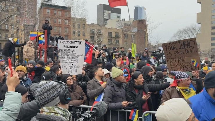 示威者和国际媒体聚集在纽约联邦法院门前,等候委内瑞拉总统马杜罗出庭受审。