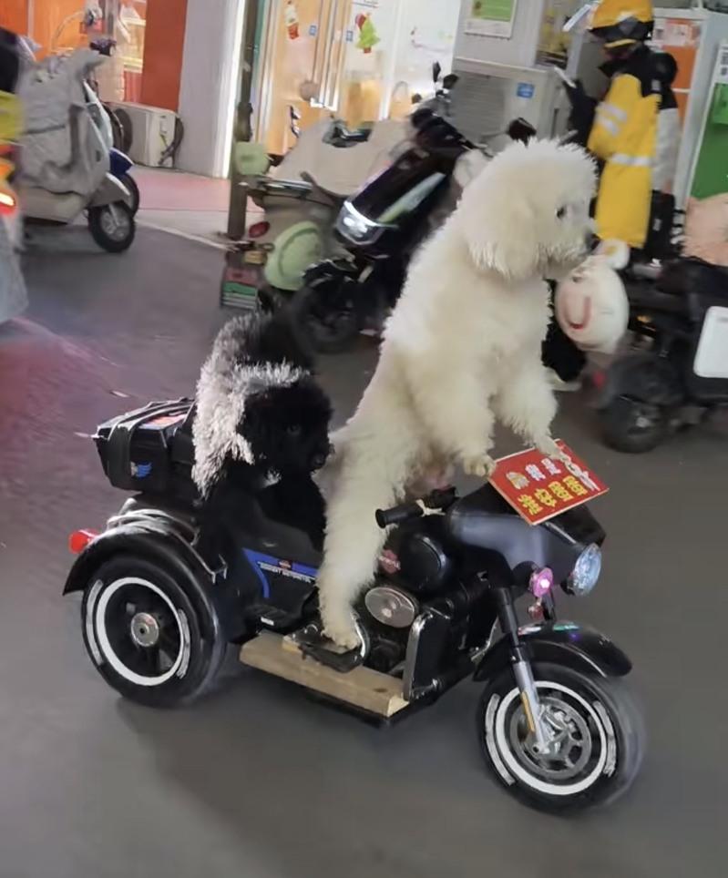 据澎湃新闻报导,网友发布的视频中,在一处交通繁忙的街头,突然出现一只白色小狗「骑车」经过,两只前脚还放在「机车」握把旁一个看板上,定睛一看,后座还趴着一只黑色小狗,在车流中东张西望。只见白色小狗「驾驶」目不转睛的盯着前方行驶,两只后脚就踩在「机车」踏板上,看来不是第一次「骑车」。