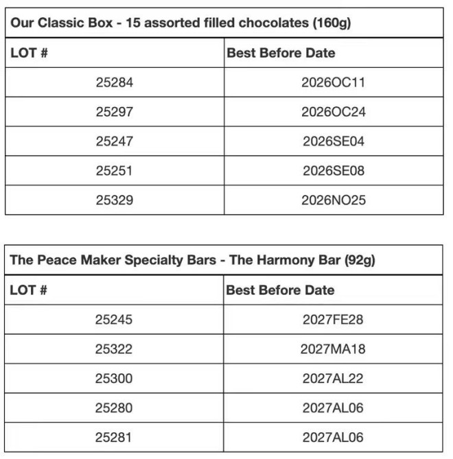 1月8日,加拿大Costco分享了新斯科舍省巧克力公司Peace by Chocolate发布的一则通知。该公司正在召回两款产品,分别是The Harmony Bar和Classic Box of 15 assorted filled chocolates,这两款产品曾于9月7日至12月3日期间在网上销售。