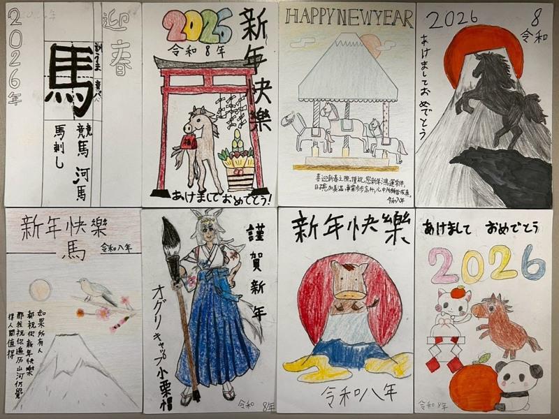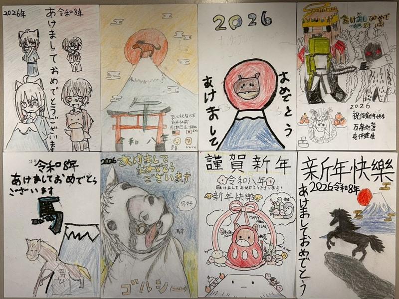 校方指出,为期5天的国际教育交流返台后不久,在2026年新年伊始,学校收到来自东京中华学校学生亲手绘制、亲笔书写的新年贺卡祝福,一张张色彩缤纷的卡片上,有富士山、鸟居、达摩、不倒翁与生肖图像,搭配中日文「谨贺新年」「新年快乐」「2026 令和八年」等祝福语,童趣十足、诚意满满,让师生又惊又喜。